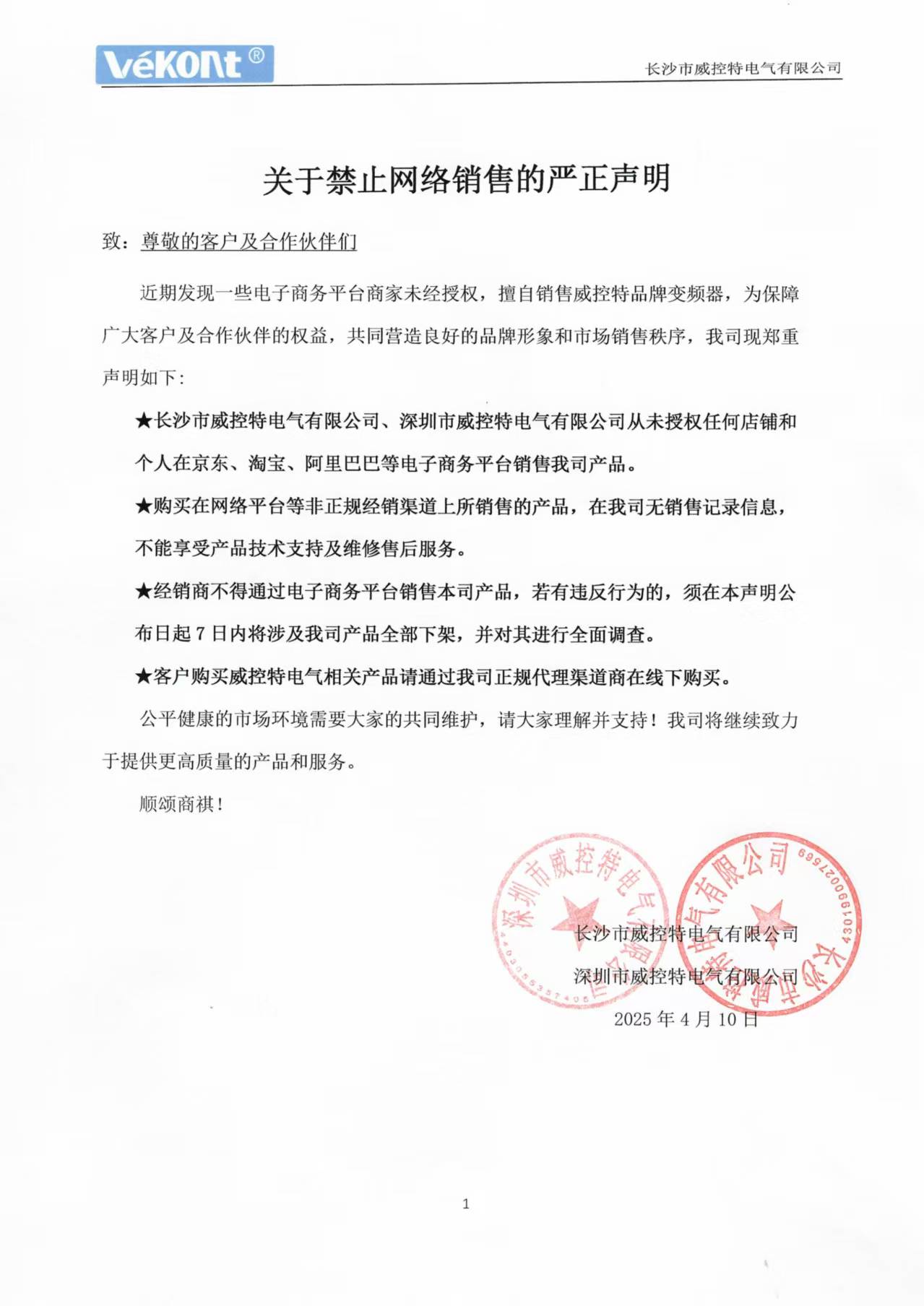 近期发现一些电子商务平台商家未经授权,擅自销售威控特品牌变频器,为保障广大客户及合作伙伴的权益,共同营造良好的品牌形象和市场销售秩序,我司现郑重声明如下